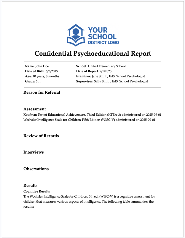 Click “Create Report” and add the student/client information. A full report template will be generated with headers (Assessments, Review of Records, Interviews, Observations, Results) and your custom content.